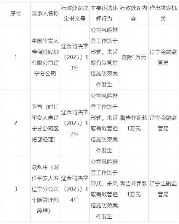 平安人寿辽宁分公司被罚1万元:风险排查工作流于形式等